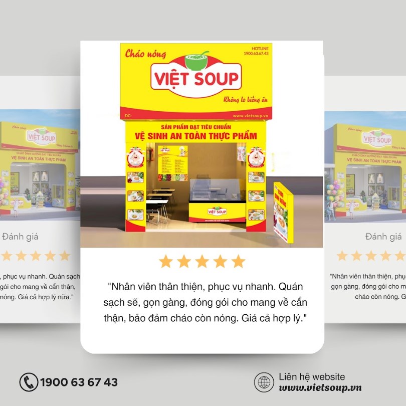Việt Soup gần đây chinh phục khách hàng không bằng lời quảng cáo hoa mỹ, mà bằng từng chi tiết nhỏ trong cách nấu, cách phục vụ và cách giữ chất lượng ổn định mỗi ngày. Nếu bạn đang tìm một điểm mua cháo vừa tiện, vừa ngon, vừa đáng tin cậy cho gia đình, chỉ cần liên hệ 1900 63 67 43 để được hướng dẫn tìm cửa hàng Việt Soup gần đây để bạn yên tâm gắn bó lâu dài nhé.