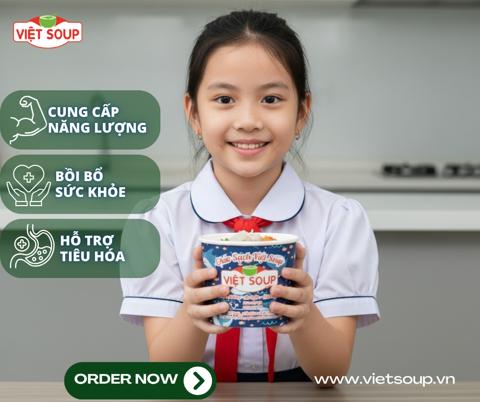 Với mong muốn đồng hành cùng phụ huynh trong hành trình nuôi dưỡng con khỏe mạnh, cháo dinh dưỡng Việt Soup mang đến menu hơn 20 món cháo nóng tươi ngon, sạch, giàu dinh dưỡng được chế biến từ nguồn nguyên liệu an toàn. Việt Soup tự hào là lựa chọn tin cậy giúp ba mẹ yên tâm chăm con mỗi ngày, đặc biệt trong mùa lạnh khi sức đề kháng của trẻ cần được quan tâm hơn bao giờ hết.